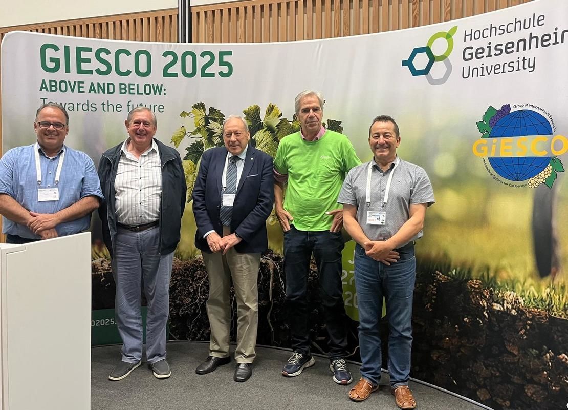 Em uma das fotos do evento, Pesquisador Giuliano (1° à esquerda) aparece ao lado de figuras históricas do GiESCO, como o francês Alain Carbonneau e o italiano Giovanni Cargnello (criadores do grupo), além do alemão Hans Schultz (presidente da Universidade de Geisenheim) e do francês Laurent Torregrosa (presidente do GiESCO). *Viviane Zanella/Embrapa Uva e Vinho - [email protected] - Tel: (54) 3455-8084.