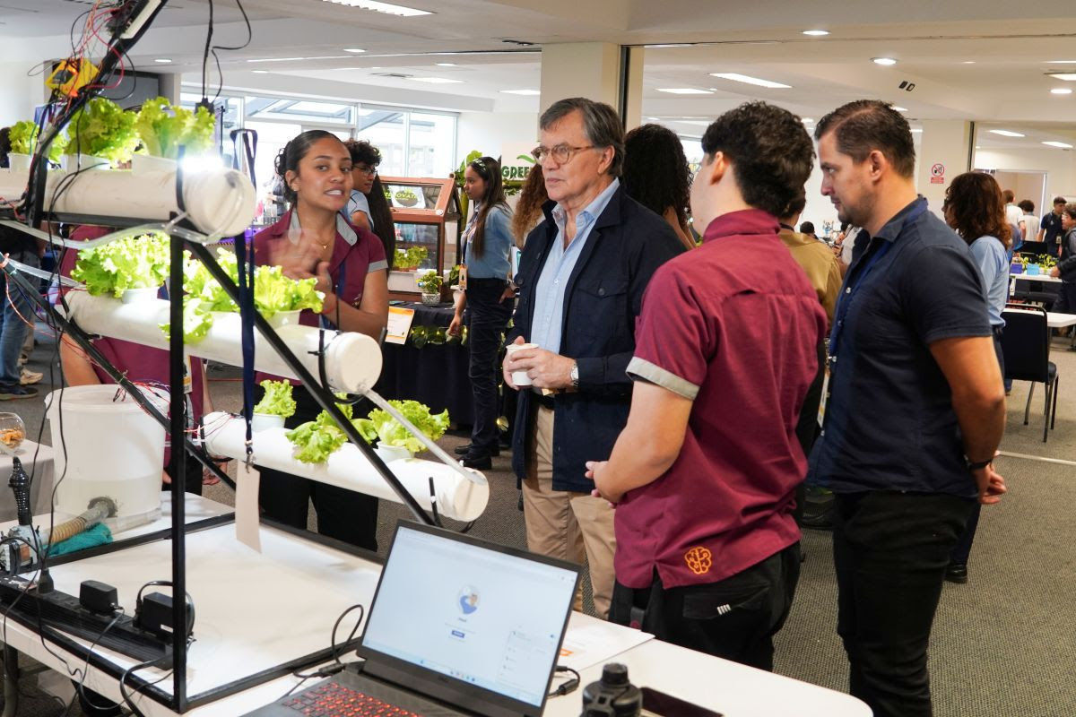Diretor Geral do IICA, Manuel Otero (centro), visitou as diferentes exposições dos projetos do desafio de robótica, onde destacou o talento jovem como chave para uma agricultura mais inovadora, limpa e sustentável