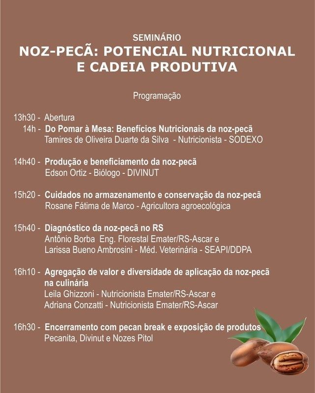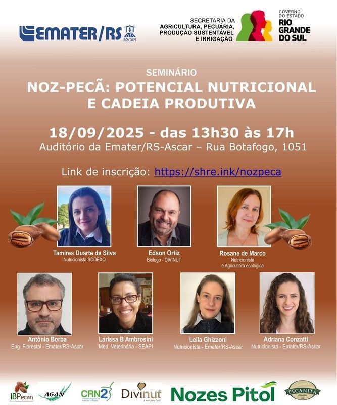 A Emater/RS-Ascar promove na próxima quinta-feira (18/09) o seminário "Noz-Pecã: Potencial Nutricional e Cadeia Produtiva", no Escritório Central da Instituição, em Porto Alegre. O evento terá palestras que vão do cultivo e manejo dos pomares até as possibilidades de utilização da noz-pecã na culinária, reunindo produtores, nutricionistas e consumidores. As inscrições podem ser feitas até segunda-feira (15/09), pelo link https://shre.ink/nozpeca.