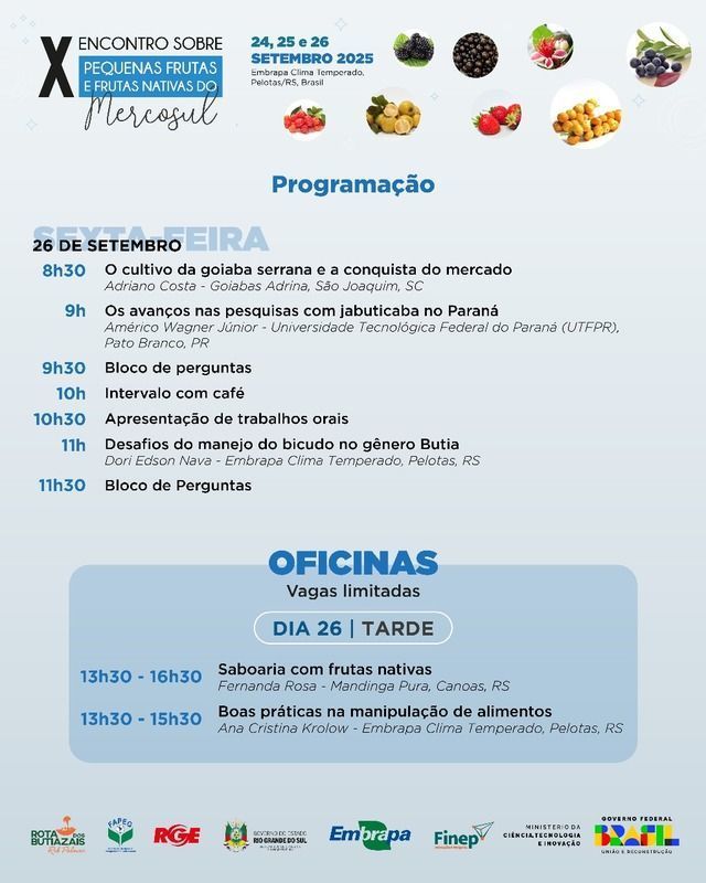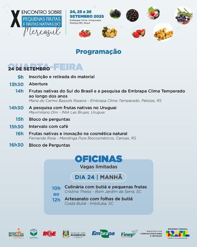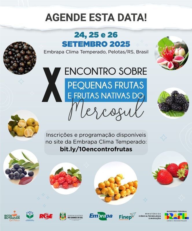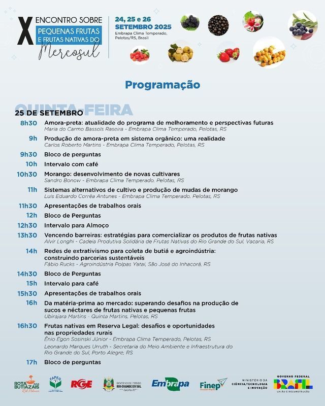 Confira a programação do evento - https://www.embrapa.br/busca-de-eventos/-/evento/495617/x-encontro-sobre-pequenas-frutas-e-frutas-nativas-do-mercosul