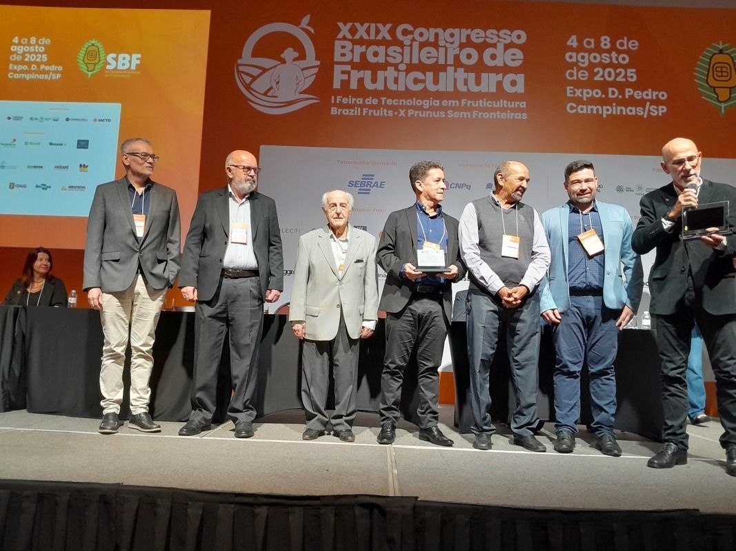 Da esq. para direita: 6° na foto, presidente da Sociedade Brasileira de Fruticultura (SBF), pesquisador e Dr. Henrique Belmonte Petry da Epagri de SC, recebendo homenagem no XIX CBF em Campinas/SP