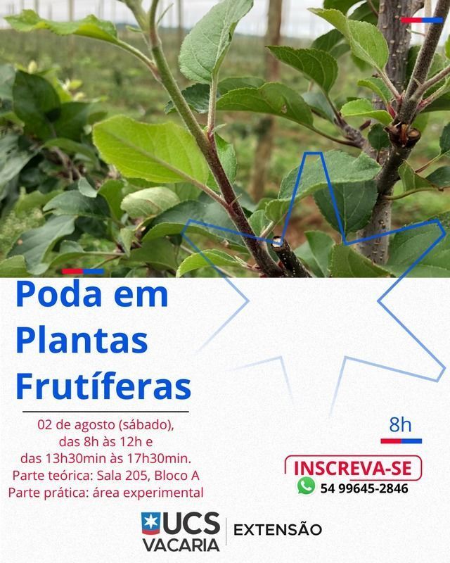 "Poda em Plantas Frutíferas" na UCS Vacaria. Será realizado no dia 02 de agosto (sábado), das 8h às 12h e das 13h30 às 17h30. A parte teórica acontecerá na sala 205, Bloco A, e a prática será desenvolvida na área experimental do Campus.