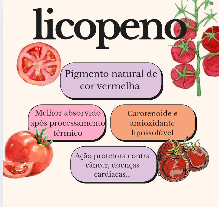 Portanto, o modo como o tomate é preparado influencia diretamente na sua disponibilidade como composto funcional. Além disso, como o licpeno é lipossolúvel, o consumo de derivados processados, principalmente quando