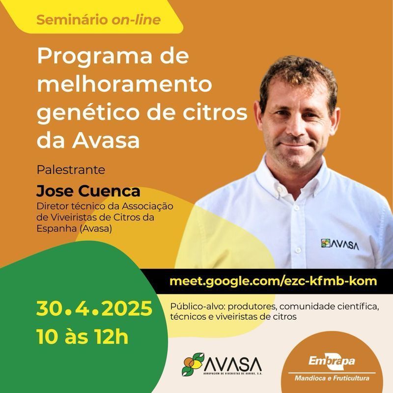 Nesta quarta-feira (30), das 10h às 12h, a Embrapa Mandioca e Fruticultura (Cruz das Almas, BA) realiza seminário online sobre o programa de melhoramento genético de citros da Associação de Viveiristas de Citros da Espanha (Avasa), com o diretor técnico da instituição, Jose Cuenca.