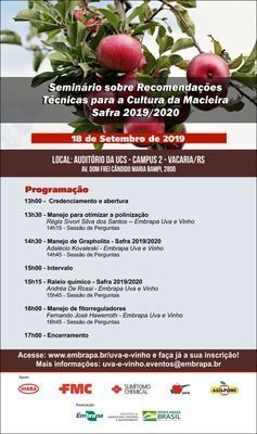 A Embrapa Uva e Vinho realiza, no dia 18 de Setembro de 2019, o Seminário sobre Recomendações Técnicas para a Cultura da Macieira - Safra 2019/2020.