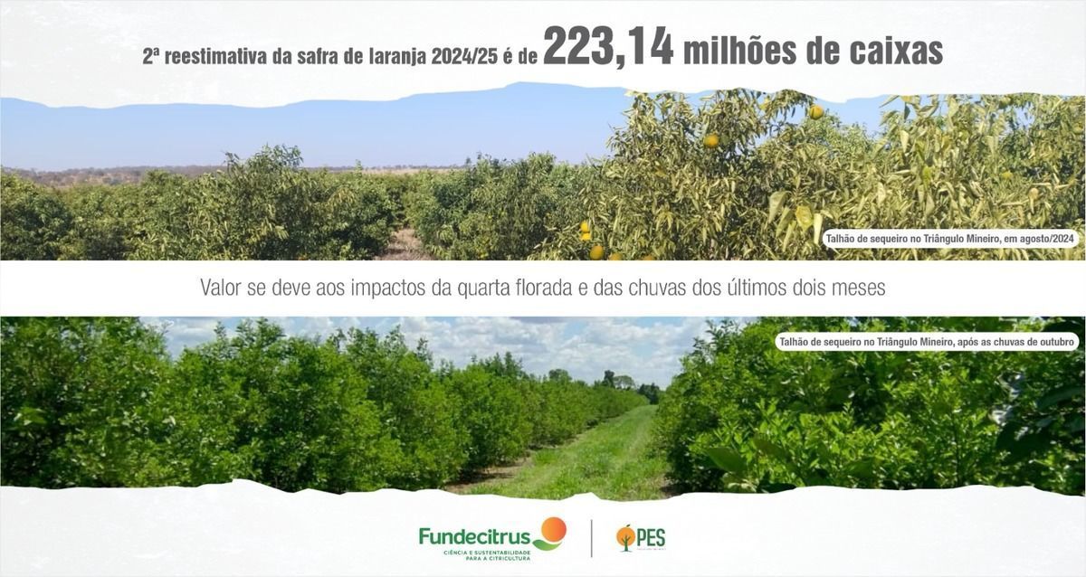 Divulgada pelo Fundecitrus nesta terça-feira (10), a segunda reestimativa indica que a safra de laranja 2024/25 no cinturão citrícola de São Paulo e Triângulo e Sudoeste Mineiro deverá ser de 223,14 milhões de caixas de laranja de 40,8 kg, 3,4% maior do que o número projetado na reestimativa anterior (215,78 milhões de caixas, em setembro) e 4,0% menor do que a projeção inicial (232,38 milhões, em maio).