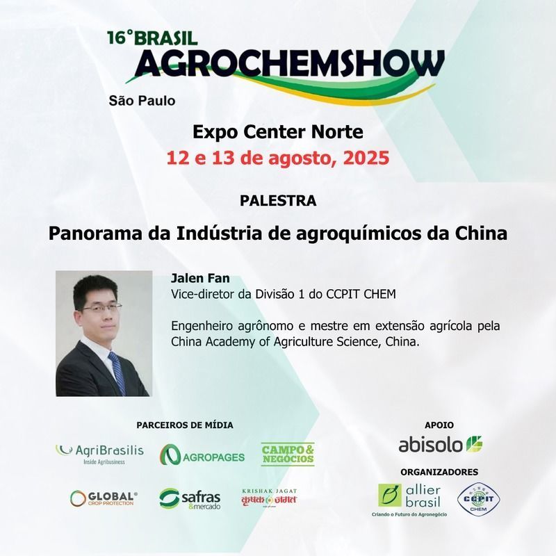 16º Brasil AgroChemShow - Organizado pela AllierBrasil e a CCPI Chem-China, o evento acontecerá nos dias 12 e 13 de agosto, no Expo Center Norte, em São Paulo, com programação de palestras que conta com tradução simultânea em português, inglês e mandarim.