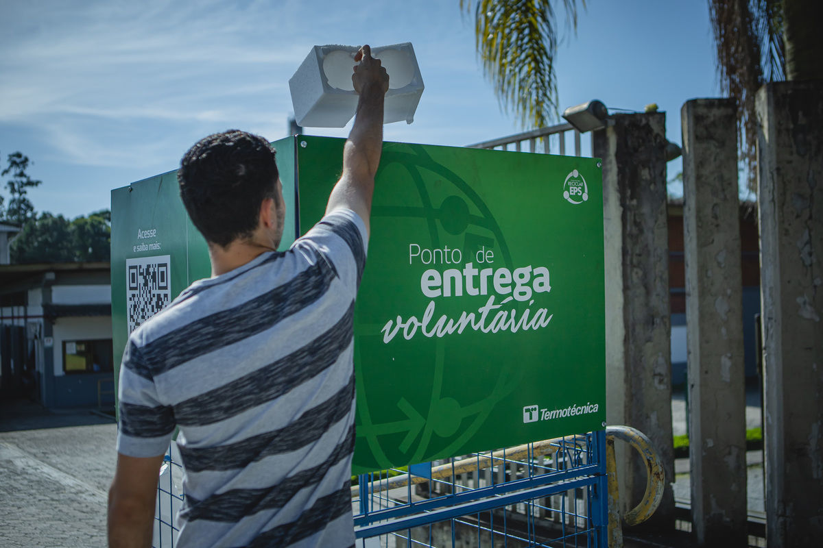 Processo de reciclagem de embalagens de EPS pós-consumo em uma das unidades da Termotécnica e PEV - Ponto de Entrega Voluntária em frente à fábrica - Foto: Divulgação/Termotécnica