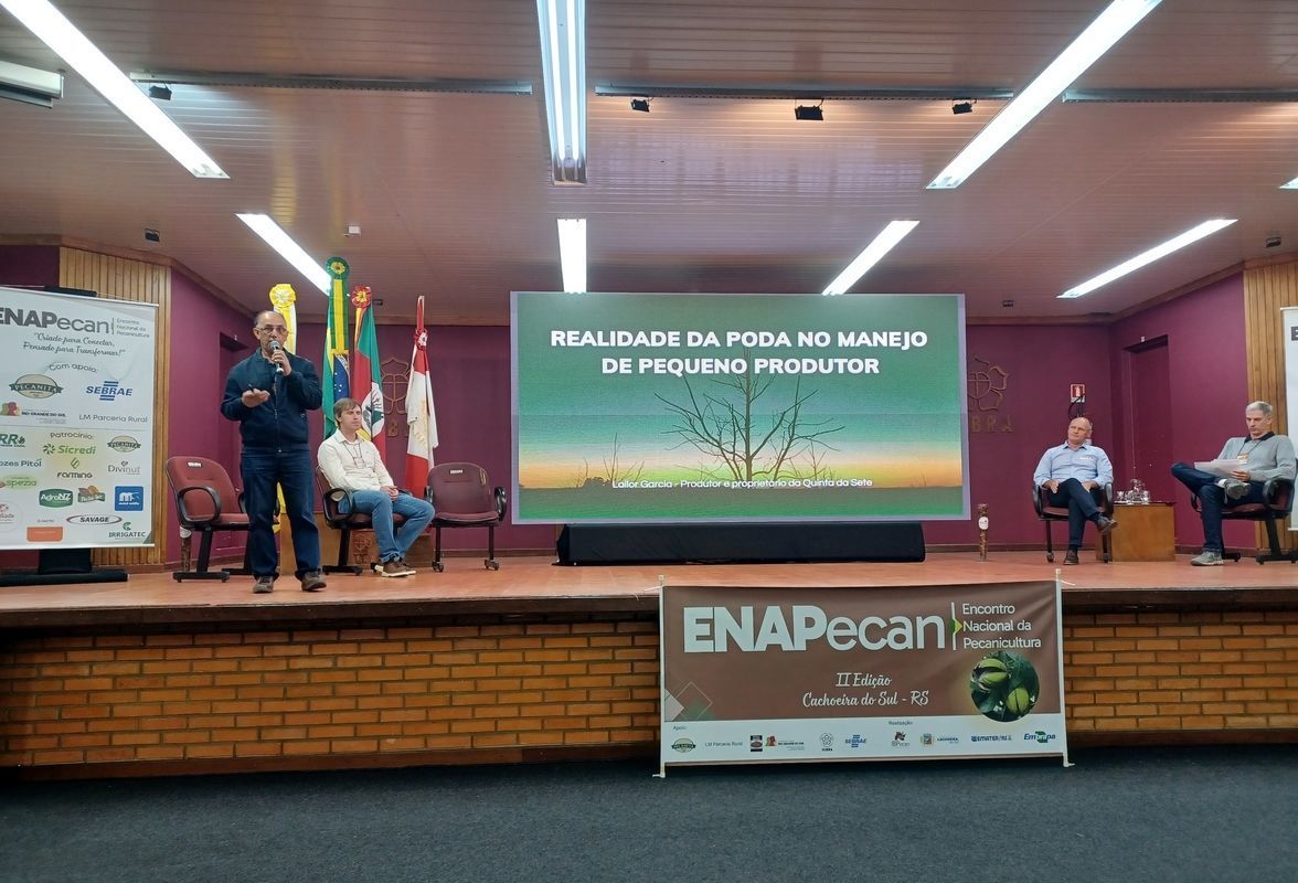 Podas e manejo de pomares marcam início do segundo dia do ENAPecan - Painéis abordaram alternativas para pomares sombreados, com destaque para técnicas de poda hedge nos EUA, estudos comparativos da Embrapa e experiências práticas de produtores brasileiros - O segundo dia de programação do II Encontro Nacional da Pecanicultura (ENAPecan) começou nesta sexta-feira, 7 de novembro, com o Painel "Alternativas para `Pomares Sombreados - Podas de Formação, Abertura e Desbaste", com moderação do pecanicultor Daniel Basso. A primeira palestra foi "Tecnologia da Poda Hedge nos Pomares dos Estados Unidos", com a participação, por vídeo, do professor Lenny Wells da University Georgia - Estados Unidos. Ele explicou as técnicas de poda de pomares usadas nos Estado Unidos e os consequentes resultados, inclusive na prevenção de pragas e aumento da rentabilidade do pomar.