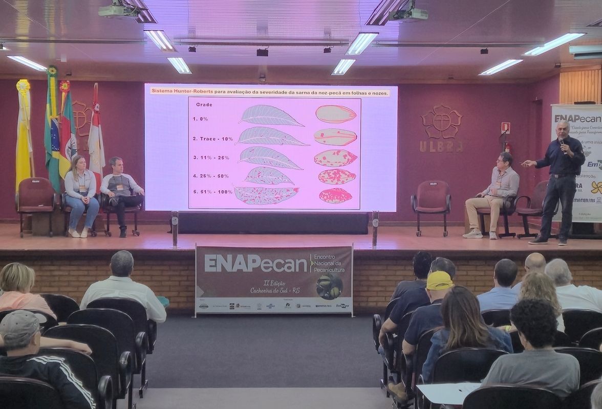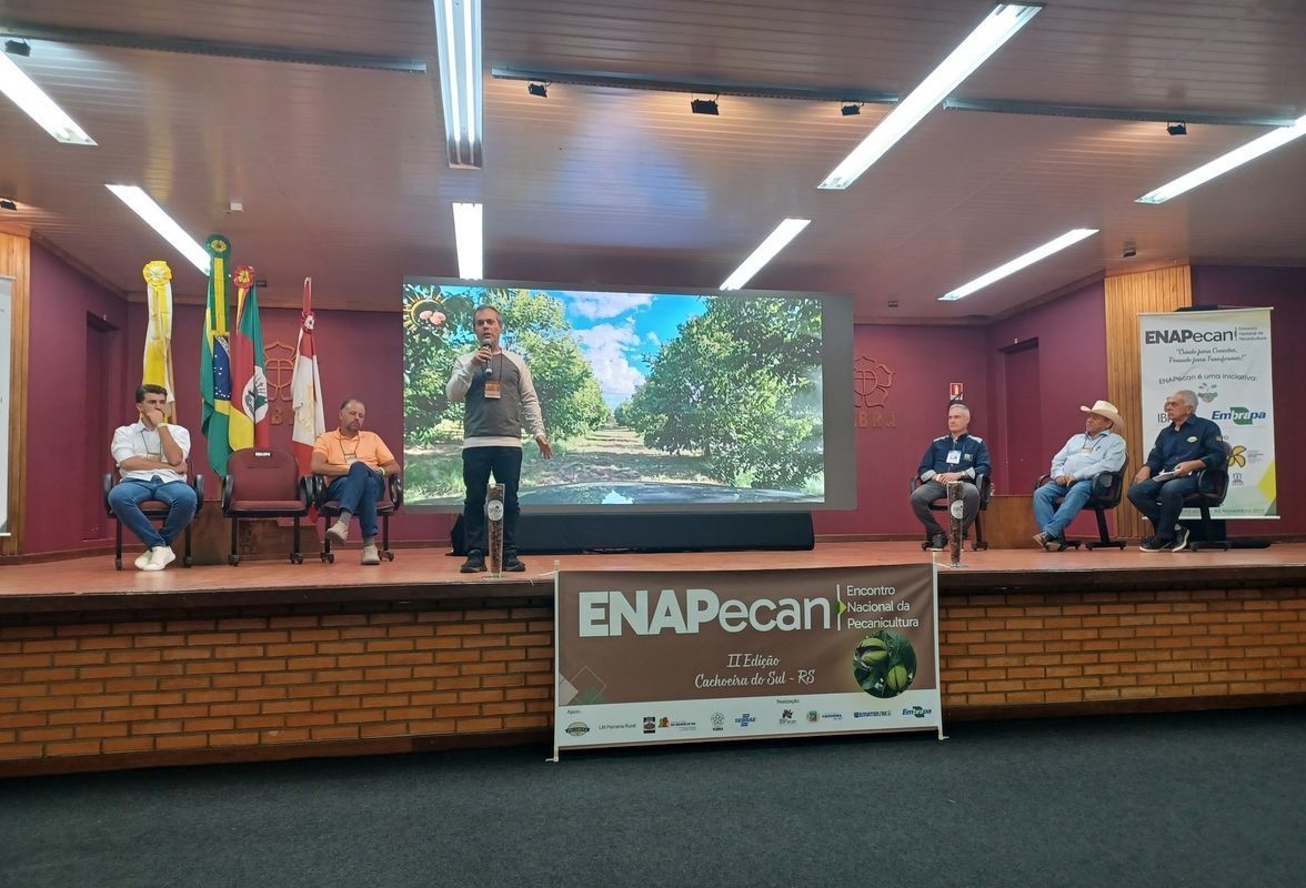 Mudanças climáticas desafiam produtores e impulsionam novas estratégias na nogueira-pecã - Painel no ENAPecan reuniu especialistas para discutir causas da queda de frutos, doenças, pragas e estratégias de manejo diante das mudanças climáticas na cultura da noz-pecã - A cadeia da noz-pecã foi tema de debate na quinta-feira, 6 de novembro, no campus da Ulbra, em Cachoeira do Sul (RS). A programação do segundo Encontro Nacional da Pecanicultura (ENAPecan) teve durante a manhã o Painel "Queda de frutos e redução de produtividade: Causas e Manejo Preventivo", com moderação do engenheiro agrônomo da Embrapa Clima Temperado, Jair Costa Nachtigal.