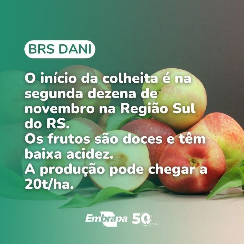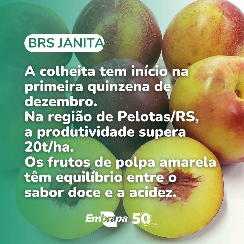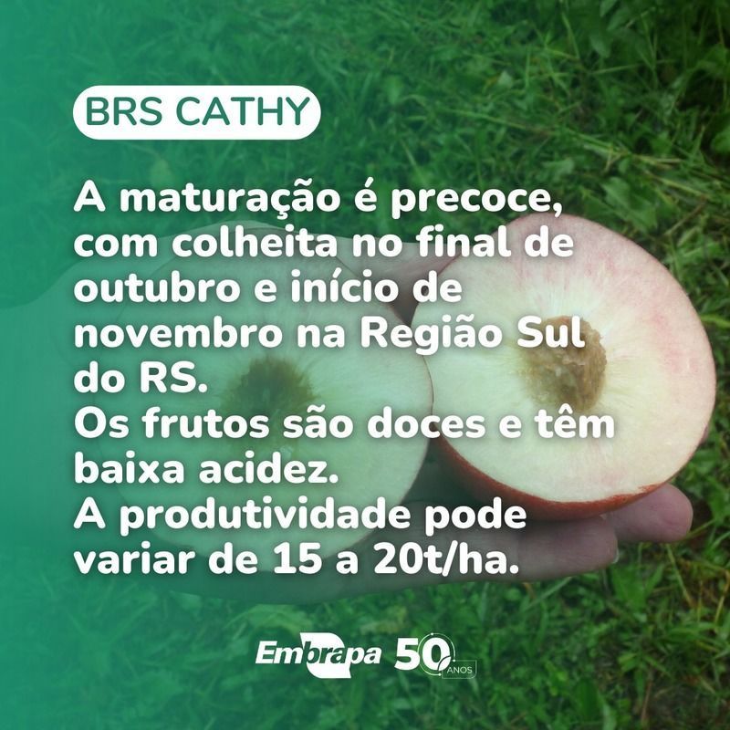 Tecnologias para a Fruticultura - Em função da realidade produtiva da região Sudeste, também estão sendo apresentadas algumas das cultivares de pêssego de mesa mais recentes desenvolvidas pela pesquisa: BRS Sarau (2023), BRS Serenata (2019) e BRS RubraMoore (2016). Quanto às nectarinas, as cultivares BRS Cathy, BRS Dani e BRS Janita, lançadas conjuntamente em 2024, possuem períodos de maturação que se complementam, garantindo produção do fim de outubro a meados de dezembro.
