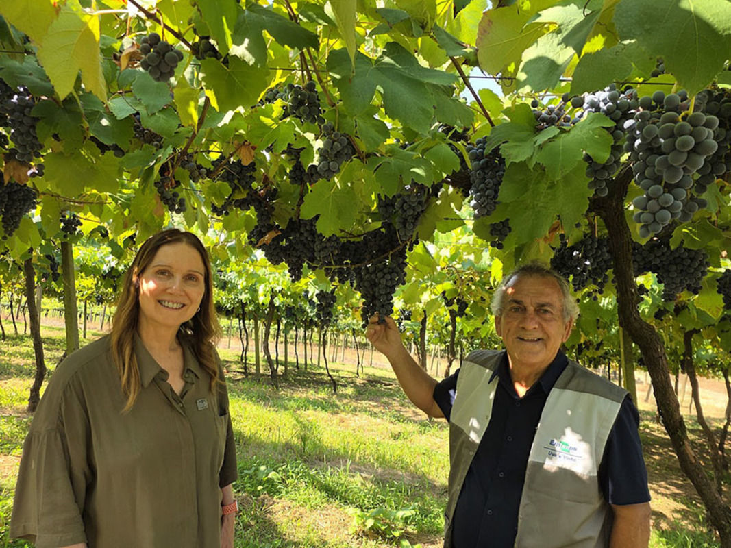 Já a BRS Antonella apresenta alto potencial produtivo, com produtividade semelhante ou superior às cultivares tradicionais mais plantadas. É indicada para aportar volume de produção e intensidade de cor em sucos e vinhos. "A BRS Antonella tem ciclo intermediário e se adapta bem à Serra Gaúcha, o que possibilita uma integração eficiente aos sistemas produtivos já consolidados", destaca João Dimas Garcia Maia (na foto abaixo, ao lado de Patrícia Ritschel), também coordenador do Programa "Uvas do Brasil".