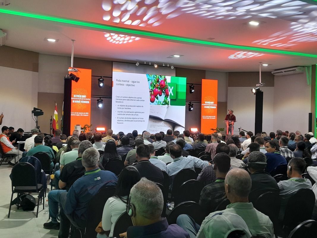 Novos sistemas de condução de pomares e porta-enxertos - Cada país e região produtora adota seu próprio sistema em função do clima, solo, mão de obra (escassa) e as variedades da fruta que o mercado pede para receber visando a exportação, por isso o grande debate e questionamentos tanto dos palestrantes, especialistas e produtores foi: qual o modelo certo a se adotar?