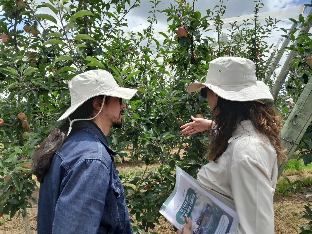 Os resultados práticos à campo, tiraram muitas dúvidas dos pomicultores que obtiveram suas respostas no mesmo instante, como Gianfranco Perazzolo (colete aberto) ao lado de Tiago da Agromillora, interagindo com os participantes do IX Field Day & XI Giro Técnico