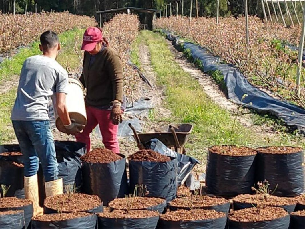 A foto que colocamos abaixo foi tirada no pequeno campo de mirtilo de Alejandro Pannunzio, localizado na Colônia Ayuí, bem perto da cidade de Concórdia, em algum momento do inverno de 2018: lá você pode ver duas pessoas começando com uma tarefa inédita naquele lugar e muito mais na agricultura argentina, o que significava carregar recipientes ou baldes de plástico preto com um substrato especial. Atrás estão as culturas convencionais.