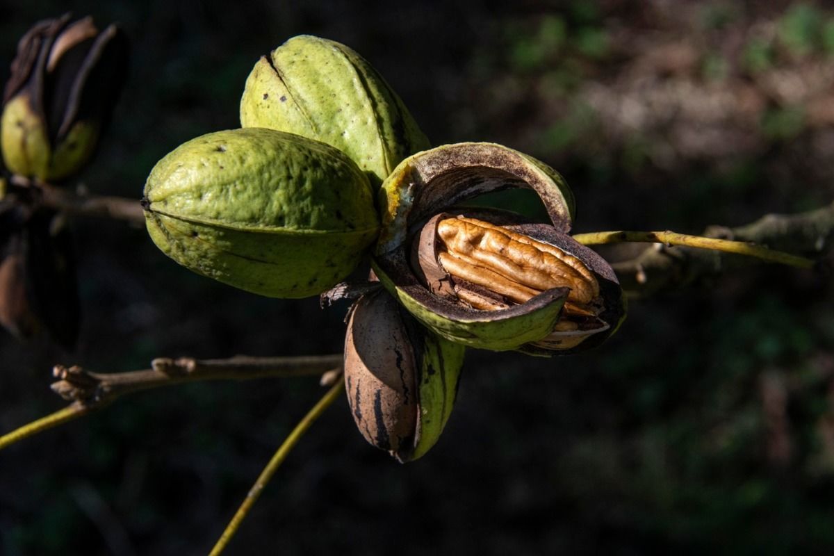 Colheita - A maioria dos produtores de noz-pecã no Estado utiliza colheita manual (62,7%), uma parcela (26,65%) utiliza o método manual e o mecânico combinados; e apenas 10% utilizam colheita totalmente mecânica.