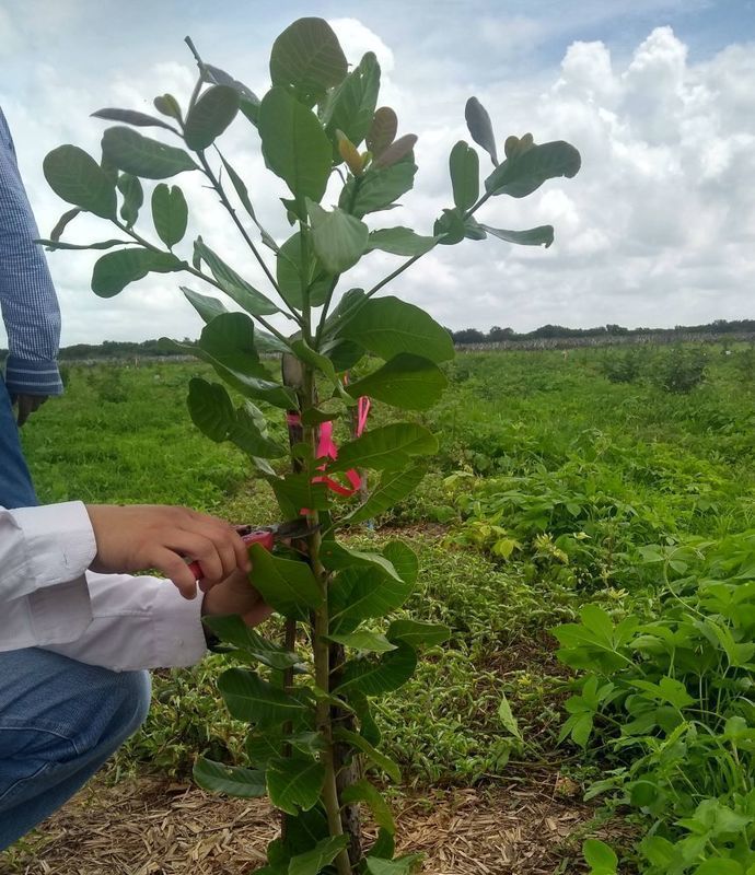 Orientações sobre cuidados pós-poda - Ainda segundo o pesquisador, como o cajueiro é uma espécie com produção periférica, ou seja, a frutificação se concentra na parte externa da copa, a poda favorece esse processo por possibilitar a brotação de novos ramos produtivos. Além disso, por ser uma planta exigente em relação à luminosidade, copas uniformes e bem distribuídas facilitam a penetração de raios solares e a exposição das folhas à luz, crucial para a fotossíntese, processo fundamental para a planta se desenvolver e produzir. A ausência dessas condições, mesmo com a nutrição adequada, pode comprometer a produtividade do pomar.