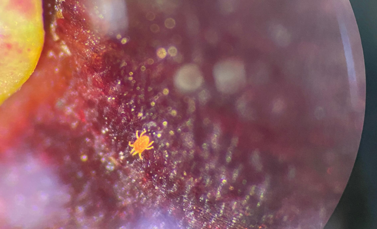 Ácaro visto com lupa durante a ação do Vigiagro (Foto: Rodrigo Martins)
