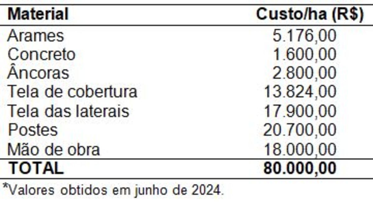Custos do Envelopamento - Em 2024, o custo para realizar o envelopamento de um pomar foi de R$ 80.000,00 por hectare (Tabela 1). Embora o custo de investimento para a instalação da estrutura seja relativamente alto, o envelopamento das áreas pode ser uma opção viável em pomares conduzidos no sistema de produção orgânica ou quando outros métodos de controle de pragas são considerados ineficientes. Dessa forma, a técnica pode ser utilizada pelos agricultores para muitas finalidades, uma delas visa evitar a entrada de insetos-praga no pomar, especialmente da mosca-das-frutas e da grafolita.