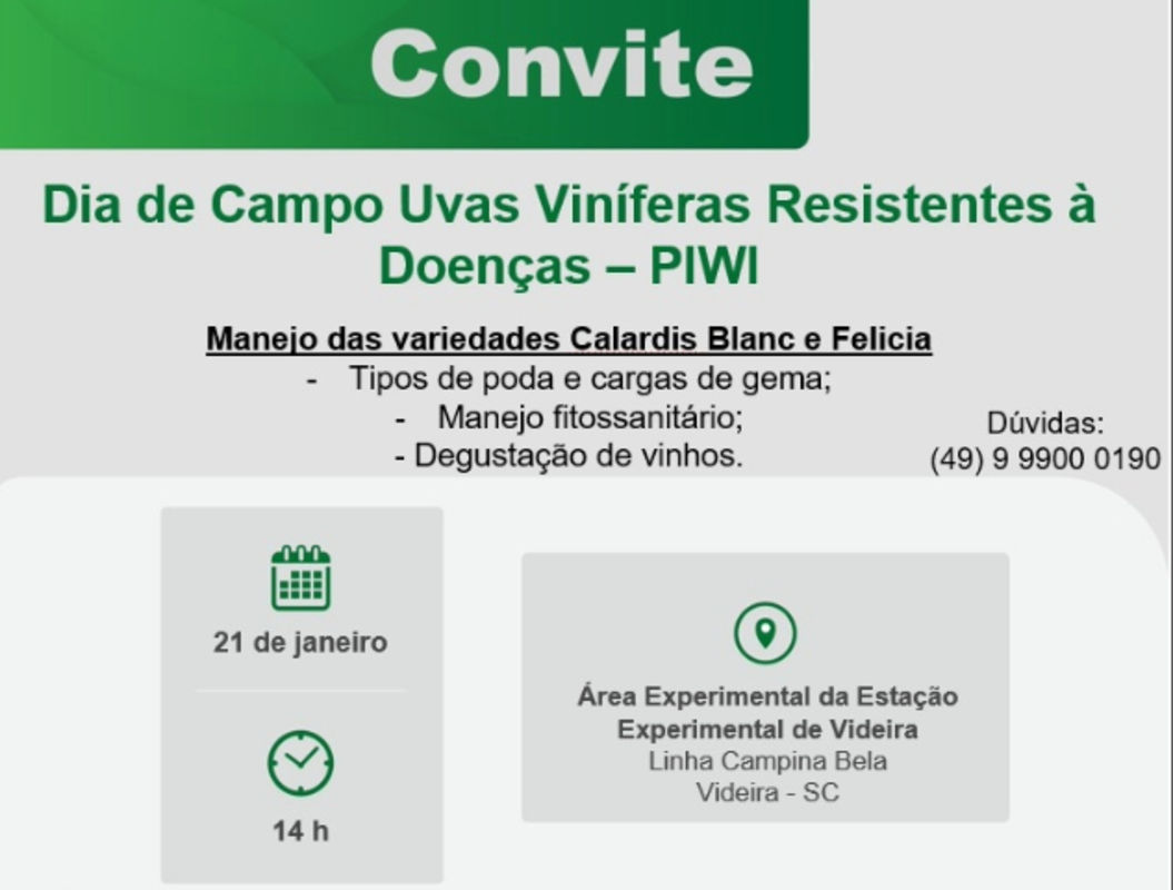 A Estação Experimental da Epagri em Videira, no Meio-Oeste, realizará no dia 21 de janeiro, a partir das 14h, um Dia de Campo sobre novas variedades de uvas viníferas resistentes a doenças, também conhecidas como Piwi.