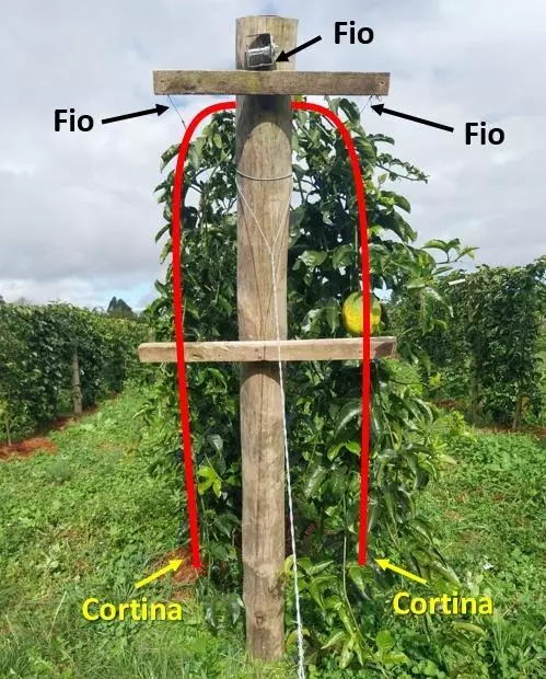 Outro ponto avaliado no experimento é o sistema de apoio no maracujazal, que além do sistema de apoio em espaldeira tradicional com 1 fio de arame onde o dossel produtivo é formado por uma cortina de ramos, adotou a formação de duas cortinas sustentado por 3 fios (Foto acima). Conforme o administrador da Estação de Pesquisa de Pinhais, Clóvis Roberto Hoffmann, esse sistema poderá dobrar a capacidade produtiva sem a necessidade de aumentar a área de cultivo devido a formação das duas cortinas que por sua vez dever-se-ão produzir mais frutos por planta, cujo sistema dever-se-á também favorecer o incremento da taxa fotossintética da planta (eficiência na absorção solar das folhas e conversão da energia luminosa em energia química) o que será importante para sustentar a maior produtividade proposta.
