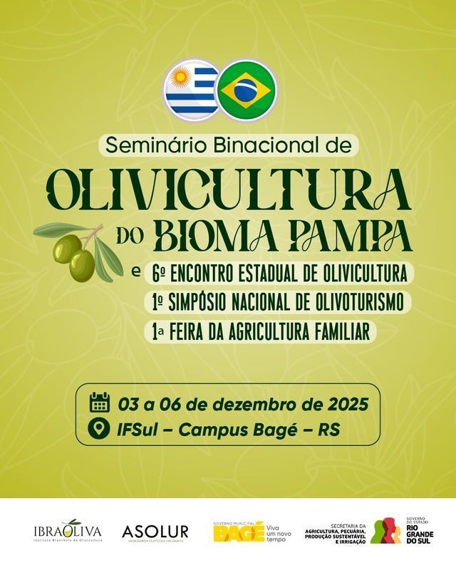 Olivicultura é tema de Seminário Binacional em dezembro - Encontro Brasil e Uruguai ocorre de 3 a 6/12, em Bagé - Entre os dias 3 e 6 de dezembro, no Instituto Federal de Educação, Ciência e Tecnologia Sul-rio-grandense (IFSUL), em Bagé, ocorre o 1º Seminário Binacional Bioma Pampa, um encontro técnico e cultural que une Brasil e Uruguai para fortalecer a produção de azeite. Produtores, especialistas e instituições se reúnem para trocar conhecimento, debater desafios, apresentar inovações e gerar negócios.