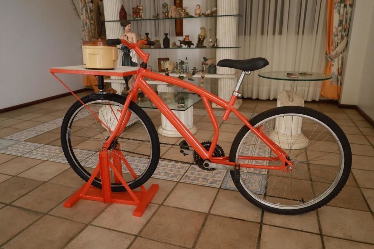 A bicicleta adaptada transforma o movimento do pedal em energia para acionar o sistema de extração de suco, permitindo o processamento de laranjas de forma prática, sustentável e com materiais de baixo custo