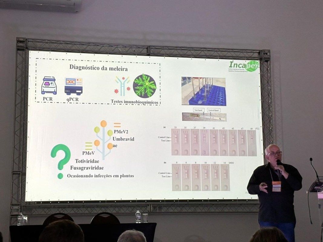 A programação técnica do evento contou com a palestra "Manejo de viroses do mamoeiro", ministrada pelo pesquisador do Incaper, José Aires Ventura. O Espírito Santo, principal exportador de mamão do Brasil, enfrenta grandes desafios devido às viroses do mosaico e da meleira, que causam prejuízos significativos à cultura. Na apresentação, Aires compartilhou resultados e experiências de pesquisas desenvolvidas no estado para combater essas doenças. Ele abordou os agentes causais, sintomas, a evolução nas lavouras e as estratégias de manejo, como o roguing (remoção e eliminação de plantas doentes).