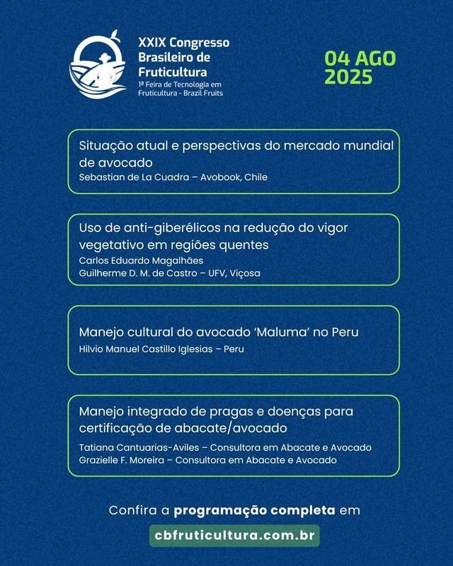 Veja programação completa do XXIX Congresso Brasileiro de Fruticultura - 4 a 08/08/2025 - Expo. D Pedro - Campinas/SP - https://cbfruticultura.com.br/
