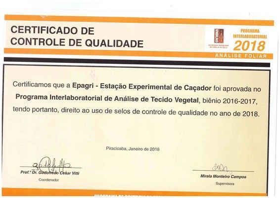 O laboratório de Ensaio Químico recebeu o selo de qualidade do programa PIATV que atesta a qualidade das suas análises, pelo quarto ano consecutivo. Os principais objetivos do selo são o de estimular a prática das análises foliares, controlar a qualidade do trabalho, garantir ao usuário a confiança nos resultados e o aprimoramento constante da metodologia de análise. "Esta conquista é muito importante, pois comprova a qualidade das análises foliares realizadas por este laboratório, dando segurança nos resultados para os produtores". A análise foliar permite o diagnóstico rápido da necessidade ou não de suplementação dos nutrientes, principalmente os micronutrientes, uma vez que a avaliação das condições da planta e a definição de adubação desses elementos não podem ser detectadas apenas pela análise do solo.