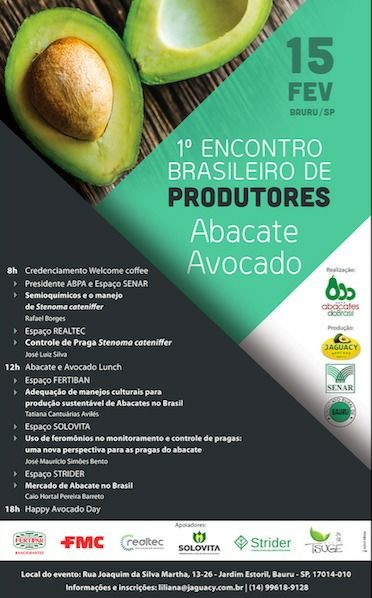 Desafios da cultura do Abacate e Avocado, gestão da propriedade, oportunidades e a importância da representatividade dos produtores de Abacate e Avocado para o agronegócio serão os principais temas abordados no 1o Encontro Brasileiro de Produtores de Abacate e Avocado que será realizado no dia 15 de fevereiro de 2017, em Bauru/SP, promovido pela ABPA (Associação Brasileira de Produtores de Abacate), e produzido pela Jaguacy Brasil, SENAR e Sindicato Rural de Bauru.