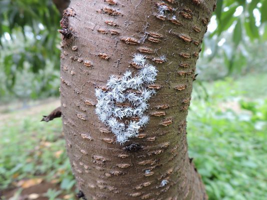 A detecção da cochonilha PSJ deve ser realizada durante todo o ciclo (especialmente no inverno) por observação direta nas plantas, examinando-se o tronco e os ramos; e na colheita, observando frutos infestados, os quais apresentam manchas avermelhadas características (Fig. 3). Plantas com a presença do inseto em tronco/ramos ou com frutos colhidos com sintomas devem ser marcadas com fitas, delimitando os focos de infestação, aonde serão direcionadas as medidas de controle, principalmente se forem detectados no início das infestações. O PSJ passa quase todo o seu ciclo de vida sob um escudo natural de proteção (Fig. 4), característico das espécies dessa família, dificultando o controle. A única fase de vida que não está sob essa proteção natural e, portanto, é mais suscetível ao controle químico são as ninfas móveis de primeiro ínstar. Assim, são muito importantes o monitoramento populacional e a identificação dos momentos de reprodução, permitindo direcionar o controle.