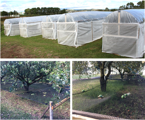 Outras pesquisas realizadas na Epagri envolvem o manejo fitossanitário e novas técnicas de colheita. Na Epagri o envelopamento dos pomares (Fig. 1) vem sendo testado com o objetivo de evitar a postura das moscas nos frutos de goiabeira-serrana. Apesar deste envelopamento ser eficiente no controle de postura da mosca nos frutos, os pesquisadores verificaram que a cobertura de plantas pode afetar a incidência de doenças na goiabeira-serrana. Araujo et al. (2017) verificaram que no sistema de cultivo protegido, os cultivares Alcântara, Helena, Mattos, Nonante e o acesso B23.16 apresentaram maior incidência de antracnose, fumagina e podridão cinzenta, e menor de mancha de Phyllachora (Fig. 2). Assim, antes de adotar tal estratégia é conveniente que o fruticultor saiba identificar qual é seu principal problema.