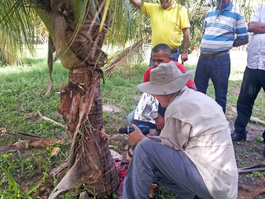 Além de teoria e conceitos, o treinamento teve conteúdo prático, com simulações de coleta de amostras nos coqueiros plantados na Embrapa.