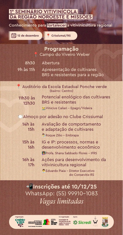 O Instituto de Gestão, Planejamento e Desenvolvimento da Vitivinicultura do Estado do Rio Grande do Sul (Consevitis-RS), em conjunto com a Associação de Vitivinicultores da Região Noroeste e Missões (NOMI), com apoio do Sicredi, Viveiros Weber e Prefeitura de Crissiumal, organizam o 1° Seminário Vitivinícola da Região Noroeste e Missões no próximo dia 12 de dezembro, no município de Crissiumal. As inscrições são gratuitas e devem ser realizadas até 10 de dezembro pelo WhatsApp (55) 99910-1083.