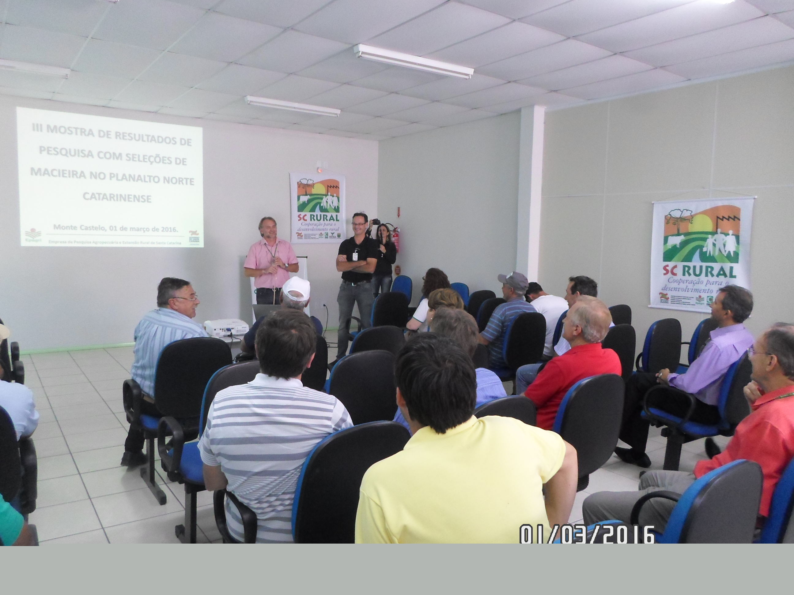O evento foi organizado pelos engenheiros-agrônomos, Marcus Vinicius Kvitschal, Maraisa Crestani Hawerroth e Marcelo Couto, pesquisadores em Melhoramento Genético da Macieira da Estação Experimental de Caçador, pelos extensionistas rurais da Epagri de Monte Castelo, Josinei Antonio Tissi e Vendelino Skonieski e o assessor técnico da Cooperpomares, Daniel Grein Neto. Para mais informações, entre em contato com: Epagri Monte Castelo: (47) 3647-0335, (Tissi) ou Estação Experimental de Caçador: (49) 3561-6811 (Marcelo Couto); (49) 3561-6837 (Marcus Vinicius) ou (049) 3561-6834 (Maraisa).