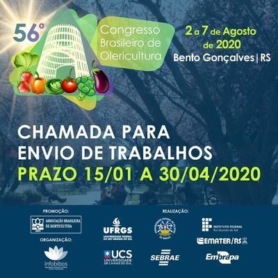 Em nome da comissão organizadora, gostaríamos de convidá-lo para o 56º Congresso Brasileiro de Olericultura, a ser realizado de 02 a 07 de agosto de 2020,