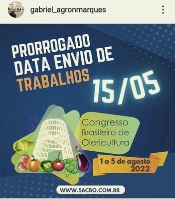 Em nome da comissão organizadora, gostaríamos de convidá-lo para o 56º Congresso Brasileiro de Olericultura, a ser realizado de 01 a 05 de agosto de 2022, em Bento Gonçalves, Rio Grande do Sul.