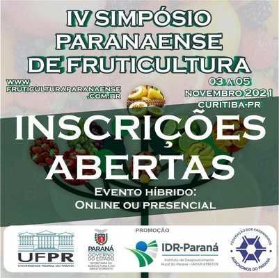 Promotores - O IV Simpósio Paranaense de Fruticultura é uma promoção do Instituto de Desenvolvimento Rural do Paraná-Iapar-Emater (IDR-Paraná), juntamente com a Secretaria estadual da Agricultura e Abastecimento do Estado, Universidade Federal do Paraná (UFPR) e a Associação dos Engenheiros-Agrônomos do Paraná (AEAPR).