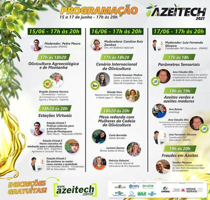 A programação completa e mais informações podem ser consultadas em www.azeitech.com.br. As inscrições para as atividades do Azeitech já podem ser feitas pelo site. Vale ressaltar que os interessados devem se inscrever para cada um dos dias de evento. Além dos eventos ao vivo, o Azeitech contará com estandes virtuais e vídeos de dicas técnicas e de consumo, que estarão disponíveis para a visitação a partir de 15 de junho, às 8h. *Mariana Vilela Penaforte de Assis/Jornalista | Assessoria de Comunicação