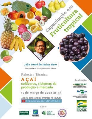 A próxima edição do evento Capacitação em Fruticultura Tropical será realizada na terça-feira (15), às 9h, e vai tratar do Açaí. A palestra técnica sobre cultivares, sistema de produção e mercado desse fruto, base da alimentação da população da região Norte do Brasil, será apresentada pelo pesquisador da Embrapa Amazônia Oriental, João Tomé de Farias Neto. Os interessados podem acompanhar pelo canal da Embrapa no Youtube e pela página da Embrapa Cerrados no Facebook.