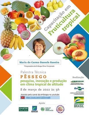 O cultivo do pessegueiro, espécie de clima temperado, é o tema da próxima edição do evento Capacitação em Fruticultura Tropical que será realizada na terça-feira (08), às 9h. A palestra técnica Pêssego: pesquisa, inovação e produção em clima tropical de altitude será apresentada pela pesquisadora da Embrapa Clima Temperado Maria do Carmo Raseira. Os interessados podem acompanhar pelo pelo canal da Embrapa no Youtube e pela página da Embrapa Cerrados no Facebook.