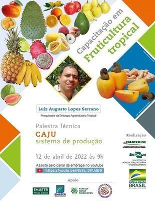 O sistema de produção do caju é o tema da próxima palestra da "Capacitação em Fruticultura Tropical", que será realizada na terça-feira (12), às 9h. A apresentação técnica será feita pelo pesquisador Luiz Augusto Serrano, da Embrapa Agroindústria Tropical. Os interessados podem acompanhar o evento on-line pelo canal da Embrapa no Youtube ou pela página da Embrapa Cerrados no Facebook.