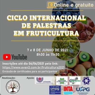 Centro de Ciências Agrárias (CCA), do Curso de Agronomia e do Programa de Pós-Graduação em Agronomia (PPGA) da Universidade Estadual do Oeste do Paraná (Unioeste), campus Marechal Cândido Rondon, realiza o Primeiro Ciclo de Palestras Online em Fruticultura nos dias 7 e 8 de junho, das 8h30 às 11h30. Mais [email protected]