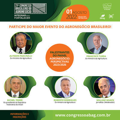 Diante desse cenário, existem diversos questionamentos sobre quais serão as perspectivas para o agronegócio nos próximos quatro anos. Desse modo, o 21º Congresso Brasileiro do Agronegócio, uma iniciativa da ABAG - Associação Brasileira do Agronegócio e a B3, a bolsa do Brasil, convidou o ex-presidente da República, Michel Temer, e os ex-ministros da Agricultura Alysson Paolinelli, Francisco Turra, e Roberto Rodrigues para compartilhar suas avaliações sobre o futuro do setor no curto prazo. O painel Agronegócio: Perspectivas 2023/2026 será moderado pelo jornalista William Waack.