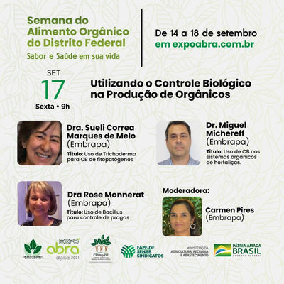 Cada vez mais o consumo de produtos orgânicos e o uso de bioinseticidas e métodos de controle de pragas ganham mais adeptos e ajudam a promover uma agricultura sustentável. Para levar informação científica sobre temas relacionados à produção orgânica, nesta sexta-feira, dia 17/9, pesquisadores da Embrapa Recursos Genéticos e Biotecnologia (Brasília-DF) e da Embrapa Hortaliças participam da live utilizando o controle biológico na produção de orgânicos.