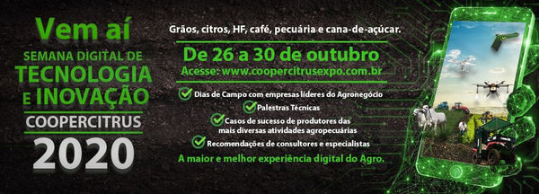 De 26 a 30 de outubro, a Coopercitrus realiza a Semana Digital de Tecnologia e Inovação, reunindo dois importantes eventos do calendário anual da cooperativa: o Simpósio de Alta Tecnologia e o Fórum de Tecnologia e Inovação Coopercitrus Credicitrus. Em novo formato, totalmente digital, e em ambiente 3D de 360 graus, o evento tem como objetivo levar informações atualizadas ao produtor rural, apresentar novas tecnologias que contribuam com a atividade agropecuária e promover debates entre especialistas e produtores, reafirmando o propósito do agronegócio para a sociedade.