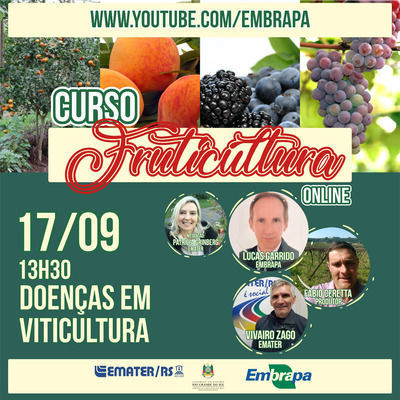 De 15 a 24 de setembro, Embrapa Clima Temperado (Pelotas, RS) e Emater/RS-Ascar realizam Curso Online sobre Fruticultura. Em quatro lives, que correspondem a um módulo cada, serão abordados temas como implantação e manejo de pomares (15), doenças em viticultura (17), mosca-das-frutas (22) e as culturas da amora-preta e do mirtilo (24). As lives são gratuitas e realizadas sempre às 13h30min, no canal da Embrapa no Youtube.