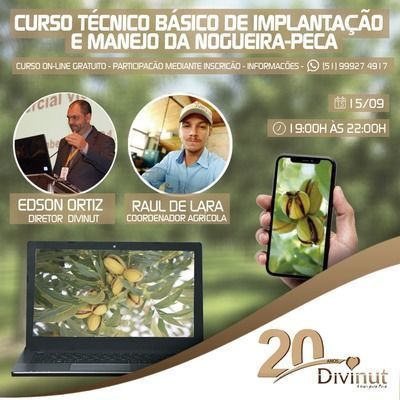 Nesta terça-feira dia 15 de setembro, a Divinut Nozes - uma das maiores processadoras de nozes da América do Sul - promove o primeiro curso técnico básico online de Implantação e Manejo da Nogueira-pecã, realizado pela empresa. O curso, totalmente gratuito, é destinado àqueles que tem interesse em iniciar na cultura da nogueira-pecã, e terá início às 19h sendo transmitido pelo YouTube.
