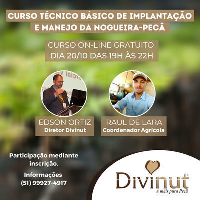 O acesso ocorre mediante inscrição pelo link: http://b.link/xp6pl . A iniciativa é do empresário e especialista no assunto, Edson Ortiz, que há mais de 30 anos trabalha com o cultivo, processamento e comercialização de noz-pecã. O curso também contará com orientações do coordenador agrícola da Divinut, Raul de Lara.